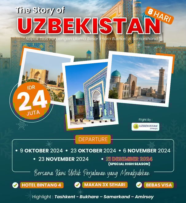 Nikmati pengalaman perjalanan yang mendalam dan kaya sejarah dalam tour ke Uzbekistan. Anda akan terbang menuju Tashkent, ibukota Uzbekistan, dan menjelajahi kota-kota bersejarah seperti Bukhara dan Samarkand, selama delapan hari.