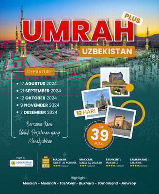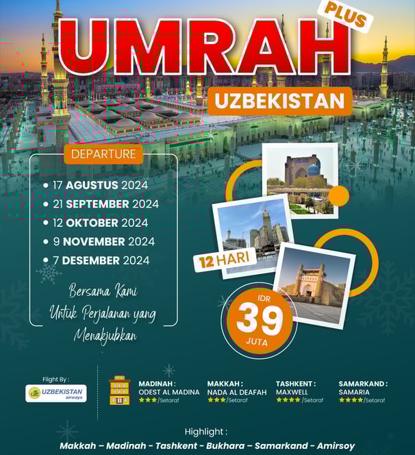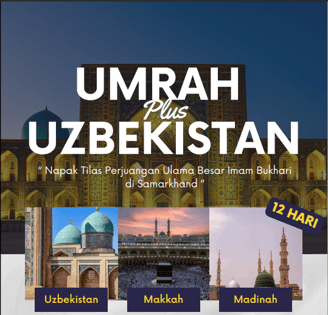 Nikmati Umrah plus tur Uzbekistan, mengunjungi situs sejarah Islam di Samarkand dan Tashkent, dilanjutkan dengan Umrah di Makkah dan memperbanyak ibadah di Madinah.